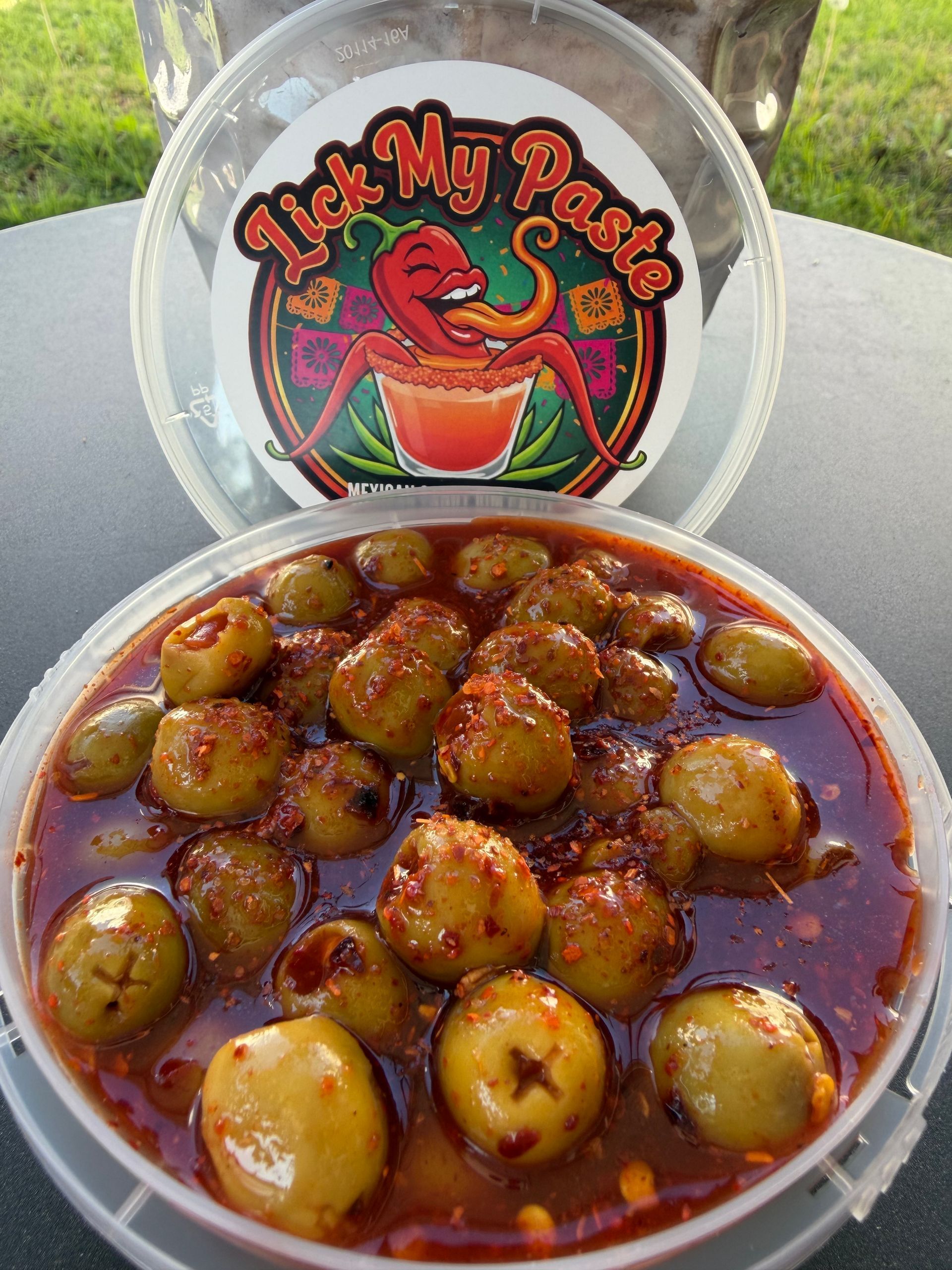 Briny green olives with a bold, flavorful makeover. Each olive is tossed in Lick My Paste, blending salty, tangy, and spicy into one seriously craveable bite. The contrast of savory olive + chili-lime heat is unexpected — and wildly good.
